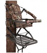 Closed-front aluminum climbing stand Suspended foam-padded seat with backrest in Mossy Oak Break-Up Infinity camo Weighs 20 lbs. and holds up to 300 lbs. Green Utility Strap 18” W x 12” D seat size,...
