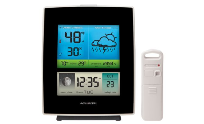 The AcuRite® Weather Station with Color Display is a great way to stay on top of changing weather trends. It features an illuminated color display with an option that automatically dims the backlight in the evening; a stronger signal for 330', through-the-walls penetration; and an IntelliTime® self-setting clock and calendar that automatically update for Daylight Saving Time. The AcuRite Weather Station features 24-hour high and low indoor/outdoor temperature, plus trending graphs for humidity, temperature, and barometric pressure.