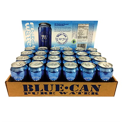 Protect your loved ones by preparing your home and office for the worst-case scenario. The US National Guard and Red Cross recommend storing a minimum of 64oz per day per person in sealed containers. Our single serve cans make it easy: just one case per person for 4 days of disaster water. 24 Pack: 12oz. of water per can, 2 1/4 gallons total per case. Water is more important than food during a disaster or emergency. Store Blue Can Water in your home, office and vehicle. Be prepared with our 50 year Pure Water Guarantee. Emergencies happen, be prepared with Blue Can Water Storage! Earthquake Flood Tornado Hurricane Tsunami Power Outage Blizzard Typhoon Terrorist Attack Municipal Water Shutdowns Big Book Catalog, Issue:68, Page:555