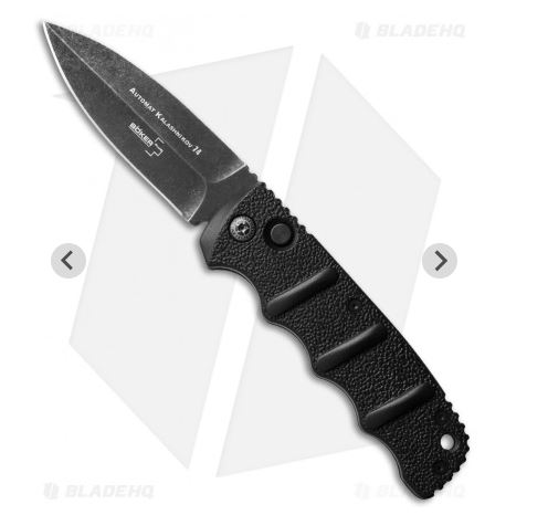 This Blade HQ Exclusive smokewashed Boker Kalashnikov features a black D2 blade and a black aluminum handle. Features: Smokewashed dagger blade, upgraded to D2 steel. Push button automatic* opening action. Black coated aluminum handle. Plunge lock mechanism. Deep carry pocket clip. Description: In 1947, Mikhail Kalashnikov completed development of a rifle designed to arm millions of Soviet soldiers. It is now known as the AK-47 and remains in active use to this day, being the most manufactured rifle in history. It is so loved because it gets the job done, is very economical, and keeps ticking, no matter what you throw at it. The Boker Kalashnikov knife is inspired by the iconic weapon, with a simple design, no frills, and maximum functionality. The Kalashnikov is made of high-performance, high-value materials. It has a strong lock, dependable action, and a handle that just wants to go to work. The Kalashnikov truly is a knife that makes its namesake proud! Boker Kalashnikov Knives come in many sizes, a variety of blade shapes, and tons of colors! These knives also come in AUS-8 steel for a price you can't beat! Looking to add some flare to your Kalashnikov? Check out these sleek Flytanium pocket clips! These pocket clips only fit the regular models not the Mini or the XXL. *Automatic conversion knives are retrofitted by a third party to accept a coil spring. The factory warranty on these knives is void, but we do warranty the conversion/spring of these knives for one (1) year from date of purchase. Item #BHQ-25999 MSRP: $69.95 Our Price: $54.95 (44) In Stock! Quantity 1 Login to add items to your Wishlist Specifications Overall Length: 7.625" Blade Length: 3.25" Cutting Edge: 3.00" Blade Thickness: 0.12" Blade Material: D2 Blade Style: Dagger Blade Grind: Flat Finish: Black Stonewash Edge Type: Plain Handle Length: 4.375" Handle Thickness: 0.67" Handle Material: Aluminum Color: Black Weight: 3.70 oz. User: Right Hand Pocket Clip: Tip-Up Knife Type: Automatic Opener: Push Button Lock Type: Button Lock Brand: Boker Model: Kalashnikov Model Number: 01KALS109NSOI Country of Origin: Taiwan Best Use: Everyday Carry Product Type: Knife