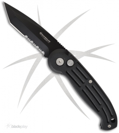 The Magnum 018 knife features a black Teflon finished stainless steel tanto blade with a partially serrated edge. The black anodized aluminum handle has a tip-down pocket clip for easy everyday carry.
