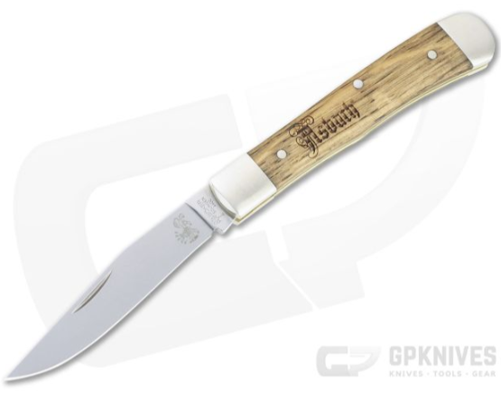 Handle: Mounted to brass liners with brushed nickel silver pins and bolsters the brandy barrel oak wood covers offer a warm feel with a beautiful, rustic aesthetic. Forgoing a traditional shield, the front cover has been engraved "Asbach" for the brandy that gives this Trapper its name. A stainless steel back spring delivers smooth, snappy slip joint operation. Includes high-quality felt zipper pouch and numbered certificate of authenticity.