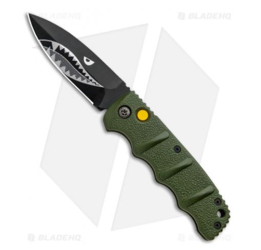 This Blade HQ exclusive Warhawk edition Kalashnikov features an OD green handle with a yellow firing button, and a red pocket clip.