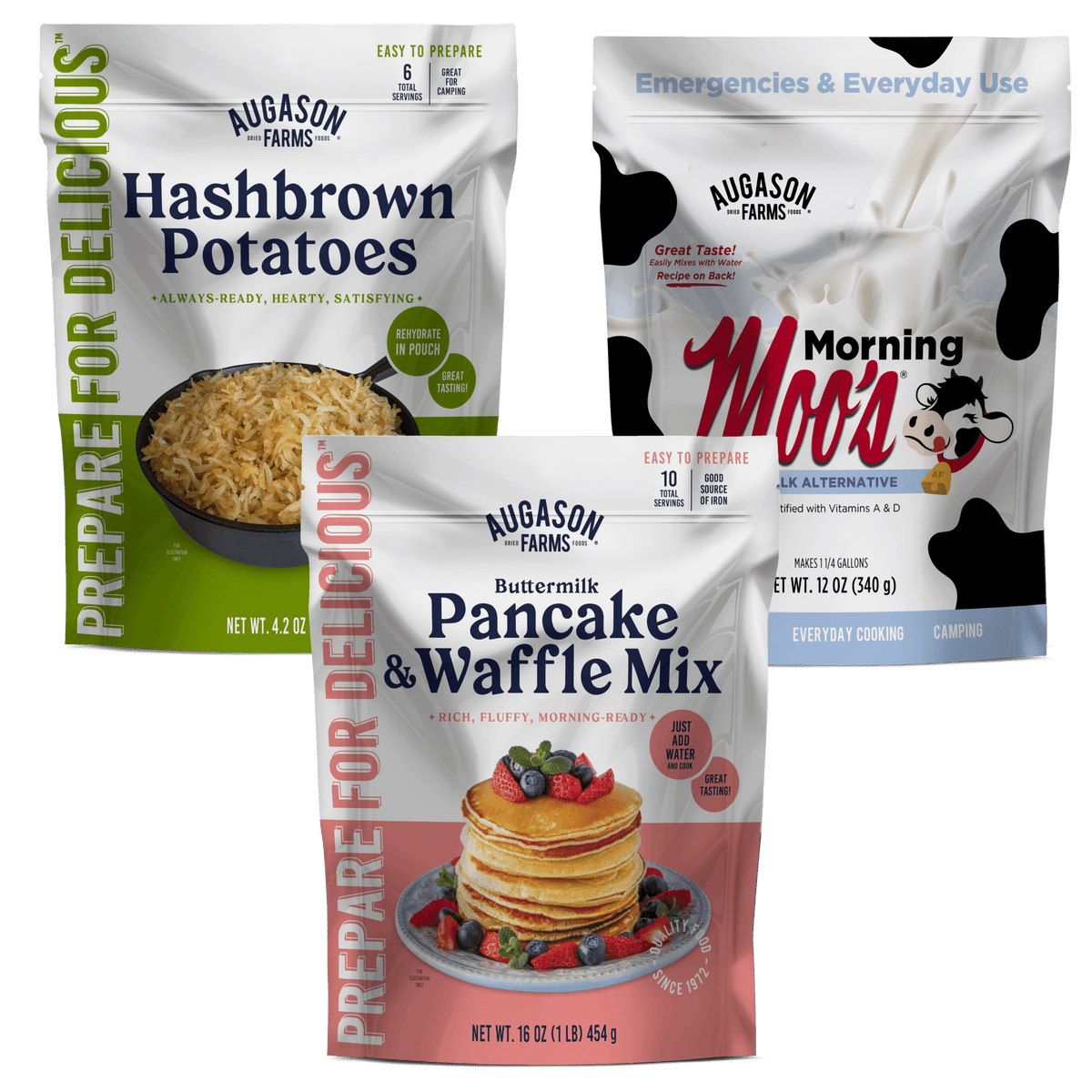 Start your day right with the Augason Farms Breakfast Essentials Variety Pack, featuring three customer favorites: Morning Moo’s® Milk Alternative, Buttermilk Pancake & Waffle Mix, and Hashbrown Potatoes. Whether you're stocking your pantry or preparing for emergencies, this bundle brings convenience, comfort, and great taste to the table while offering the best value compared to buying individually.