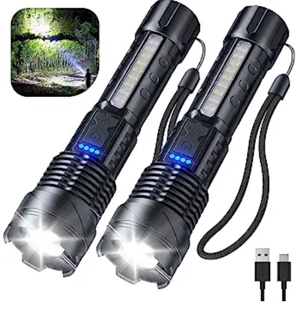 Cinlinso Flashlight High Lumens Rechargeable 2 Pack, 200000 Lumen Super Bright Led Flashlights with 7 Light Modes, IPX6 Waterproof, Zoomable, Powerful Handheld Flash Light for Camping Emergencies