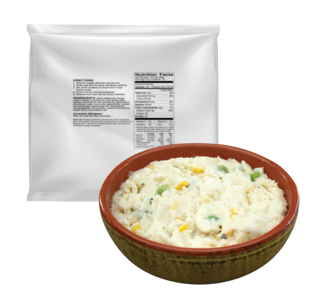 Hearty and comforting, Farmhouse Potatoes are made with dehydrated potato flakes, freeze-dried corn and peas, creamy chicken flavor, and a touch of parsley. Just add cold water—no heat or cooking required. Enjoy an easy, satisfying meal straight from the pouch.