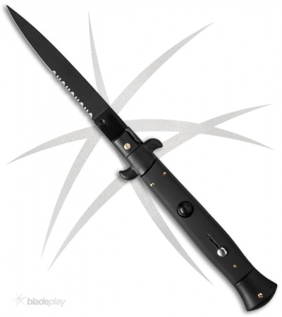 This Frank B stiletto offers impressive tactical design at an affordable price. The midnight black coloring gives the knife an ominous look and enhances the tactical design. As always with Frank B items, you get powerful action and a solid lock-up. It comes in a black, partially serrated blade with a flat grind and the Frank B Italy stamp of authenticity. This knife offers high quality design and fast auto action at an amazingly affordable price.