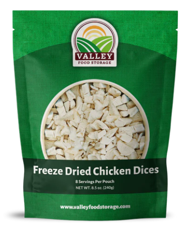 The most essential and highly sought after food source for survival is protein from meat. Our Freeze-dried Chicken Dices contains pure, USDA inspected chicken. Each pouch of chicken dices contain 8 servings.