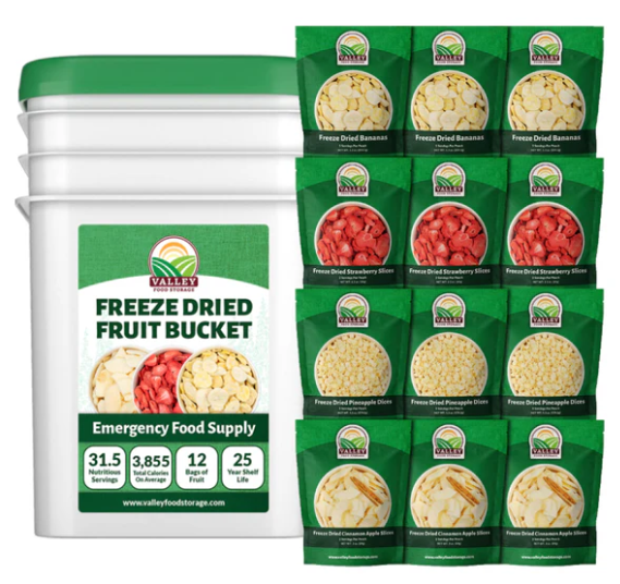 The Valley Food Storage Freeze Dried Fruit Bucket features a 12 pouch variety of our most popular freeze-dried fruit options. These fruits were picked at peak freshness and freeze-dried to preserve the integrity of the produce and the nutrients found within it.