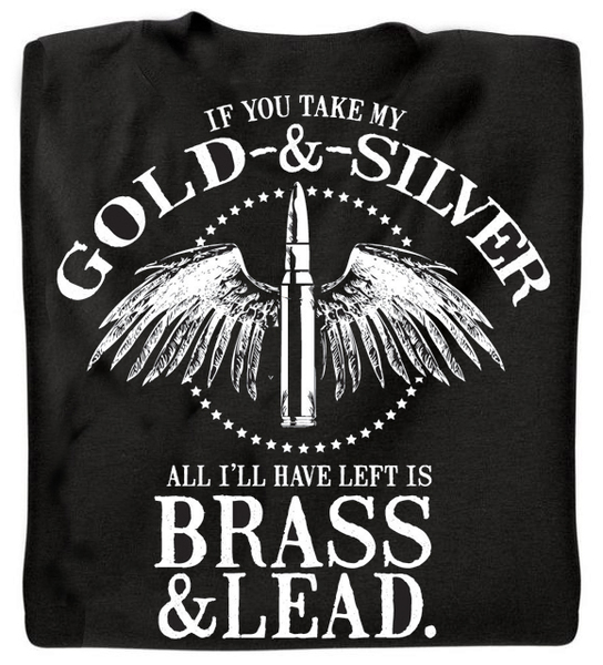 Description Reviews Related Products Product Videos Warranty Also Viewed By Category Other Details If you take my Gold & Silver... All I'll have left is Brass & Lead. Printed on the back of a black t-shirt. Because our shirts are custom-printed right here in Powder Springs, GA, please allow 9-14 days for processing.