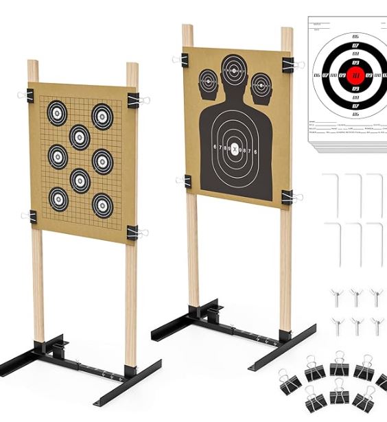 Our shooting target stand requires no extra tool to set up, which includes 2 target stands, 10 pieces 16"*12" shooting paper targets, 8 paper clips, 8 butterfly screws, and 8 ground stakes. Please be aware that 1*2 board is not included. Plus, you can cut the outer box and use it as targets as well.