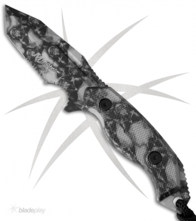 Description Description The M-Tech Tactical Military Fixed Blade Knife is a quite comfortable in hand with its jimped choil and thumb rest. The 440 stainless steel tanto blade features a vampire skull overaly with a hollow grind and a partially serrated edge. The full tang handle has gray composite textured scales with a vampire skull graphic secured by two torx screws, glass break, and lanyard hole. Includes a black nylon belt sheath with utility pocket and lanyard.
