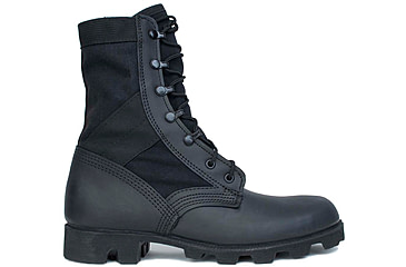 Product Info for McRae Footwear Hot Weather All Black Jungle Boot w/ Panama Sole One of the original-generation Tropical Jungle Boots. The DMS vulcanization process is used to attach the rubber Panama outsole to the upper. This process creates a bond of unprecedented strength. Featuring an upper of black full-grain leather and 1000 Denier genuine Cordura nylon fabric, this boot remains a mainstay combat boot in many foreign militaries (friendly to the USA, of course). Specifications for McRae Footwear Hot Weather All Black Jungle Boot w/ Panama Sole: Manufacturer: McRae Footwear Gender: Male Age Group: Adults Boot Shaft Height: 8 in Boot Style: Tactical Boot Color: Black Activity: Tactical Fabric/Material: Nylon Footwear Closure: Laces Fire Resistant: No Activity/Occasion: Tactical Water Resistance Level: Waterproof Condition: New Footwear Upper Fabric/Material: Cordura Features of McRae Footwear Hot Weather All Black Jungle Boot w/ Panama Sole Bottom: Military specification oil, acid, and slip resistant vulcanized rubber Panama outsole Comfort: Removable cushion polyurethane sock insert Upper: Black full-grain leather and Black Cordura(TM) upper with padded collar Closure System: Nylon coated speedhook & eyelet lacing system Ventilation: Nylon coated brass drainage vents promote rapid drying in wet conditions Package Contents: McRae Footwear Hot Weather All Black Jungle Boot w/ Panama Sole