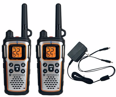 These Motorola Talkabout MU350R Rechargable Bluetooth-Ready Radios allow you to connect your radios to Bluetooth headsets so you can communicate cordlessly (Bluetooth headset not included). When you have something to say, simply press the PTT button on the radio and you'll be able to communicate with your party. 35-mile range allows long-distance communication between party members. Weather alerts provide you and your group with inclement weather warnings, and you can tune into one of seven NOAA weather channels so you always know what weather is ahead. Waterproof design so you don't have to worry about using them in the rain. Emergency-alert feature transmits an alert siren followed by transmission of spoken or incidental sounds. This allows you to send the signal to other radios and warn them of impending danger. There's also a built-in LED flashlight for peace of mind during evening adventures or unexpected emergencies and power outages. The VibraCall™ silent vibrating ringer is useful when silence is a must. iVOX acts like a speakerphone and allows hands-free communication. The Talkabout MU series has full 22-frequency capacity with 121 privacy codes to reduce interruptions. The Motorola Quiet Talk lets radios communicate with other compatible Motorola products. Charges one of four ways – the MU series desktop charger, mini-USB car cable, mini-USB wall cable or a mini-USB PC cable. Digital Signal Processing technology provides audio clarity. The Push-To-Talk Power Boost allows you to extend the transmission range by increasing the transmitter power output. Includes two radios, two AA 1300 mAh high-capacity NiMH rechargeable battery packs, two belt clips, one Y cable charging adapter with dual mini-USB connectors, one emergency-preparedness checklist, one accessories brochure and one user guide.