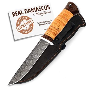 Nazarov Knives Full Stone Pattern Damascus Steel Knife - Real Damascus Hunting Knife with Nonslip Handle - Infantryman Standard Edition with Genuine Leather Sheath