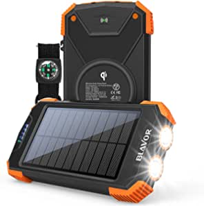 Solar Power Bank, Qi Portable Charger 10,000mAh External Battery Pack Type C Input Port Dual Flashlight, Compass, Solar Panel Charging (Orange)