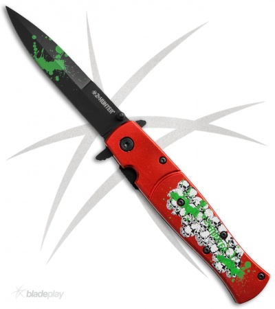Nefarious goings on are warranted when the dead rise again. The Red Menace knife is a stiletto-styled blade with a spring assisted opening. Made of durable 440 stainless steel and black coated except for the red splatter, this bayonet blade is extremely sharp. To open, use the thumb stud or one of the flippers to launch the blade open. The handles are a lightweight aluminum, metallic red, with a white skull design, the Z-Hunter logo, and green splatter. The handle has a comfortable contour so the feel is good in your hand. Comes with a black tip-up carry pocket clip.